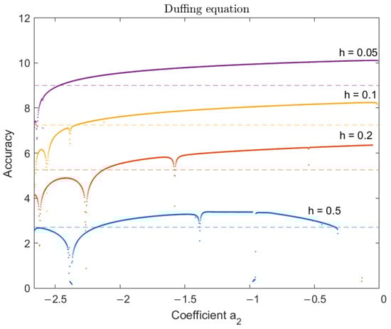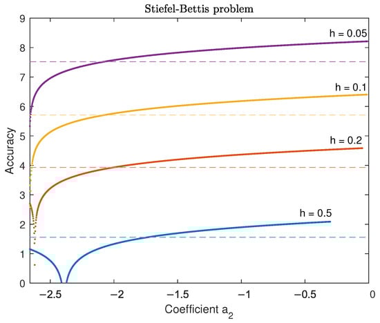 For instance, in the case of the Stiefel and Bettis problem (Figure 4), when the new method is employed with a step size of , its initial accuracy is relatively low (<5.5) for values of . However, it progressively improves, surpassing an accuracy level of 8 as . Among the other methods subjected to the same number of function evaluations required by the new method (for ), the most efficient demonstrates an accuracy of approximately , denoted by the same color dashed horizontal line (as accuracy for the other methods does not depend on the coefficient ). The intersection points reveal that the new parametric method consistently outperforms the other methods under consideration for all values of exceeding approximately . Points where the graph lacks small dots indicate that the parametric method exhibits instability. This typically occurs when employing large step-size values (h) and for high values of the coefficient ().