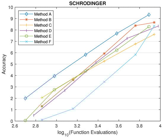 At this point, we demonstrate the accuracy of the new method against the phase-fitted methods described in Section 4.2 by choosing a value for the coefficient based on the upper limits discussed in Section 4.3. We choose to measure the efficiency of the method by computing the accuracy in the decimal digits, which is (maximum error through the integration intervals) versus the computational effort measured by the (number of function evaluations required).