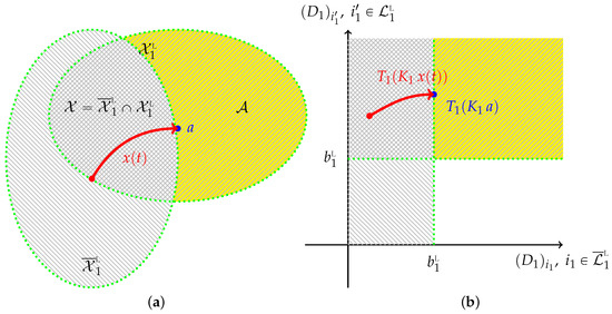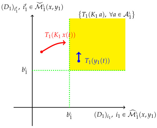 where , and . The yellow-filled rectangular region represents the set . When and , there exists such that and for t in the interval for which no switching occurs in the system. Thus, the th and th elements of the trajectory remain stationary and increase, respectively, as illustrated in the figure. Generally, according to the effect of the variable , it is expected that the trajectory will move toward a value that is greater than .