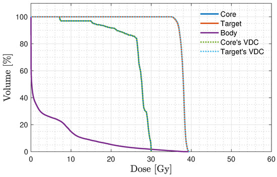 A dose-volume histogram obtained using the variable dose-constraints (VDC) method for consistent planning. Doses for Core and Target (solid lines), as well as variable dose-constraints (dashed lines) for both overlapped with each other.