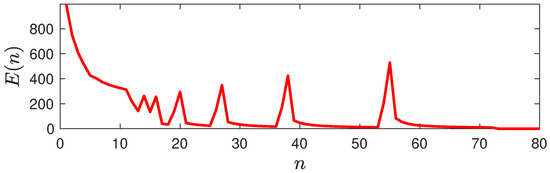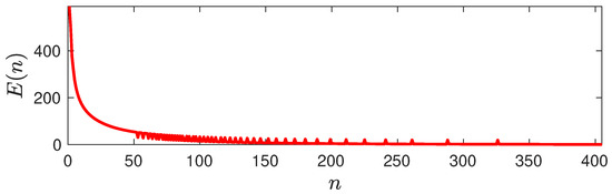 First, we focused on a consistent IMRT planning system. By utilizing Equation (30) of the iterative algorithm with fixed values of , , , and , as defined in Equation (31), and under the dose-constraints conditions presented in Table 1, we initialized with uniform positive values; set and to the prescribed dose constraints, i.e., and ; and obtained iterative sequences of the beam coefficients and variable dose-constraints denoted as , , and for . In the case of a consistent system, as indicated by the Lyapunov function used in Theorem 1, it is required not only that the beam coefficients reach an element e of the set , but also that the dose variables and converge to and , respectively. Accordingly, we defined a function to evaluate the process through which the beam variables , , and converge to the ideal solution, as given by the function , , where