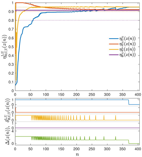 for and is presented in Figure 7 to illustrate the convergence process. The non-monotonic decrease was partially due to the switching of partly acceptable states, but, ultimately, reached 0 at with . To illustrate the transition of these partial states, the volume ratios, as disclosed in Equation (5); the acceptable indices, as indicated in Notation 3; and collaboration index, as defined in Equation (11), were plotted against the iteration numbers shown in Figure 8. The upper panel of the figure represents , , , and , while the lower panel displays , , , , and from the top to bottom. The transitions leading to the fully acceptable state through several partial acceptable states can be observed through the collaboration index . The number of iterations at which reached zero aligns with the point where the evaluation function in Figure 7 also reached zero, indicating convergence to an acceptable solution. As an example of the behavior of an element contributing to among the elements of the Target doses , the behavior of the 3870th element is illustrated in Figure 9. The alternating change between 0 and 1 in the transition of observed in Figure 8 is due to the variation of elements within the Target region, such as the 3870th element, around the lower dose bound .