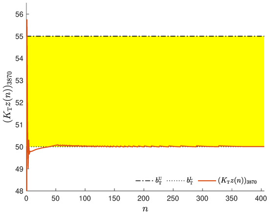 and we present the results in Figure 13a,b. From Figure 13a, the following observations can be made. When n reached 13, the 668th element entered the set as , which continued to evolve, and, as the volume fraction of the entire Target region satisfied the condition, became 0, as is also observed in Figure 12. Several iterations before n reached 13, monotonically increased in the direction where increased. Due to the increased value aimed for by , achieved values greater than the prescribed dose constraint , resulting in a more desirable outcome. On the other hand, we obtained additional insights, as shown in Figure 13b, which are as follows: During iterations from 73 to 74, dropped below , leading to a change in from 1 to 0 and causing to shift from 1 to 0. Consequently, aligned with , where . For the elements at indices 850 and 854, during the iterations from 60 to 74, remained stationary since it was larger than . For a more comprehensible understanding of the aforementioned behavior, we provide the transition of the 854th element of and over time in Figure 14. In the initial iterations, both and increased together as aimed for values larger than . However, since must also remain within the constraint set , its behavior diverged from , eventually satisfying the volume fraction condition as it entered set . At this point, all of the vector fields became zero, signifying the solutions entering a stationary state.