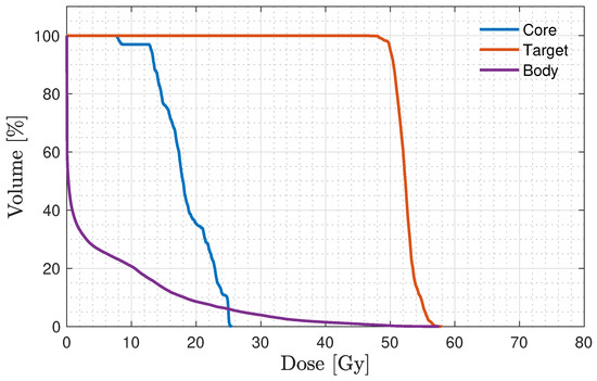 A dose-volume histogram is presented in Figure 6. This histogram illustrates the distribution of the radiation dose across different regions, showing the percentage of each region’s volume that receives a specific dose level. The Core, Target, and Body regions satisfied the consistent conditions, and it can be verified from this figure that the variable dose-constraints for the Core and Target were equal to their respective doses. In fact, as evident from the evaluation values of the function E, it can be observed that at iteration number , belonged to the set , as specified in Definition 1, and that coincided with .