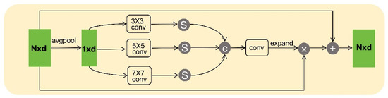 (2) The channel feature information of the input feature map is captured at different scales, thereby enabling the model to handle geometric information at various levels. Through 3 × 3, 5 × 5, and 7 × 7 convolutions, the importance of different channels is learned at multiple scales, with each feature map output still being 1 × d. Here, , where m is the number of convolution kernels, and this paper uses three convolutions.