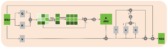 Subsequently, matrix multiplication is conducted utilizing the learnable parameter matrices q and k, which are of dimensions N/2 × d. By employing a normalization function to obtain the weight coefficient matrix between individual point channels, the resulting weight coefficient matrix is multiplied by the v values in order to compute self-attention. The final output is combined through a residual connection, and learnable parameters are applied to control the weight of each part.