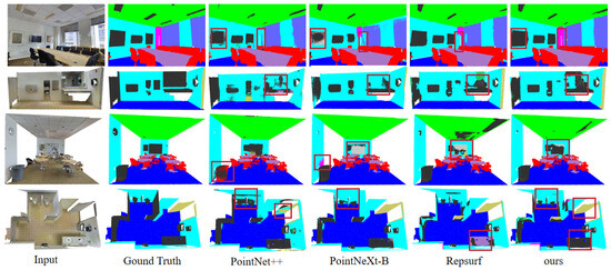 The intricate forms and multitude of indoor objects make the semantic segmentation of large indoor scenes challenging. To provide a clearer comparison among different methods, we qualitatively evaluated PointNet++, PointNeXt-B, Repsurf, and our PointMSGT by visualizing their results on the S3DIS dataset, as shown in Figure 5. PointNet++ and PointNeXt-B have a similar structure to our PointMSGT, but lack of sufficient geometric shape representation. Repsurf improves the surface representation with explicit geometric structures but suffers from noise interference, leading to misclassifications between similar categories. In Figure 5, the segmented objects in red boxes showed that our method clearly outperforms the others, especially in the column, clutter, and door categories. Our PointMSGT shows more complete and accurate shape segmentation of columns, proving that our network is more sensitive to geometric shapes, clearer at distinguishing boundary points, and less affected by noise interference, thus capturing local information in large-scale indoor scenes. We can more clearly distinguish clutter from semantically different categories such as bookshelves and boards, which have similar shapes. As shown in the top three rows, other methods tend to segment clutter as boards or bookshelves, whereas walls with hanging clutter are more clearly separated by our PointMSGT. Our PointMSGT demonstrates more precise segmentation performance and smoother object shapes compared to other methods, owing to the integration of MSGFE and GT. MSGFE represents local geometric features through triangles, constructing the spatial topological relationship between points and their neighboring points, allowing for detailed descriptions of local point cloud shapes. Other methods overlook complex local shapes, while MSGFE significantly enhances the ability to describe local shapes by incorporating geometric features such as polar coordinates, normal vectors, and triangle plane constants. The global Transformer leverages a self-attention mechanism to compute long-range dependencies between points, allowing for a more holistic capture of global features. Unlike conventional local feature extraction techniques, the global Transformer attends to the positional relationships of all points in the point cloud, offering a more accurate grasp of the overall structure in complex environments. MSGFE focuses on local geometric features, while the global Transformer emphasizes the global context. Their combination enables the model to comprehensively perceive complex indoor scenes in semantic segmentation tasks.