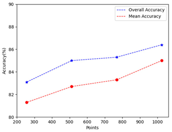 We conducted performance test experiments to evaluate the robustness with different numbers of input points. The impact of different sampled point sets was tested in the classification task with the number of sampled points set to 1024, 768, 512, and 256, as shown in Figure 6. It demonstrates relatively stable and robust performance under different sizes of input point settings, with the OA generally above 85%. When the input point count is reduced to 256, where much of the geometric information is lost, our model still achieves an OA of 83%. This illustrates that whatever variations in input counts and point cloud densities, along with differences in the distances between central and neighboring points, it is possible to obtain a balanced combination of local geometric and global contextual information to maintain the stability of the model’s performance.