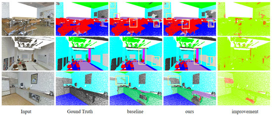 The results show that our model achieved significant improvements in recognizing categories like columns, bookshelves, and clutter, and it provides a clearer distinction between columns and walls. This indicates that our model can effectively reduce confusion from semantically different points when distinguishing structurally similar but semantically distinct objects. As shown in Figure 8, we highlighted the improved regions compared to the baseline in red, with the remaining regions highlighted in green. The improvements show that our model demonstrates enhanced performance in semantic segmentation compared to the baseline. As shown in the improvement column, our method achieves excellent segmentation results with clearer boundaries in highly similar areas (e.g., tables and chairs) and densely categorized areas (e.g., clutter, bookshelves, and walls). In contrast, the baseline produces visually blurred results in categories such as clutter, columns, and tables. Our model’s enhanced ability to distinguish between semantically similar categories such as columns and walls is particularly noteworthy, showing superior performance in handling subtle differences in complex indoor scenes.