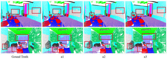 The purpose of our MSA module is to compute multi-scale attention maps using convolution kernels of different sizes, and then fuse these maps to strengthen attention to channel features at different scales, enhancing the model’s ability to process complex geometric structures in point clouds. To examine the performance of our proposed MSA module, we performed ablation experiments on the kernel sizes and numbers: (a1) using one 3 × 3 kernel, (a2) using 1 × 1, 3 × 3 and 5 × 5 kernels, and (a3) using 3 × 3, 5 × 5, and 7 × 7 kernels. As indicated in Table 7, a3 significantly outperforms both a1 and a2, and a2 performs better than a1. A visualization of models at various scales was conducted, as depicted in Figure 9. The geometric structure predicted by a3 is much more precise, whereas a1 and a2 show unclear edge segmentation, which makes them more prone to confusion with other categories and unable to demonstrate clear geometric structures. This advantage arises from the fact that multi-scale information assists the model in better understanding features at different levels. Compared to using a single convolution kernel, multiple convolutions expand the receptive field for triangular geometric features, aggregate features of multiple local triangles, and achieve richer local geometric descriptions. By adaptively aggregating features of different scales in the local neighborhood, it further reduces redundant information, thus enabling effective learning of the local details in point clouds. The combination of 3 × 3, 5 × 5, and 7 × 7 convolution kernels delivers the best performance, demonstrating that it spans different scales from small to large, enabling better capture of multi-level features in point cloud data.