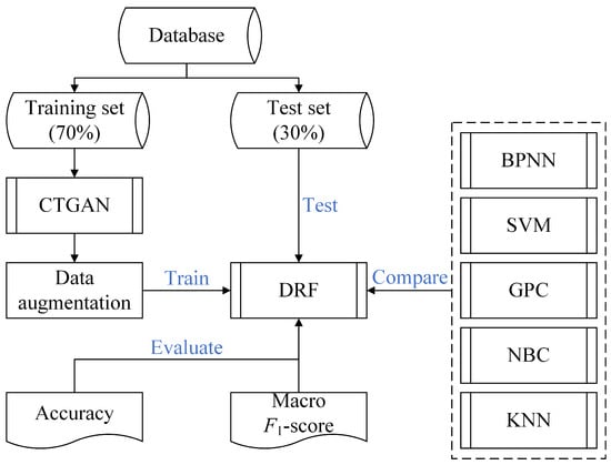 To demonstrate the superiority of the proposed model, referred to as the CTGAN-DRF, five frequently used machine learning algorithms, including the back-propagation neural network (BPNN) [], support vector machine (SVM) [], Gaussian process classifier (GPC) [], Naïve Bayesian classifier (NBC) [], and k-nearest neighbor (KNN) [], are chosen for benchmark comparison.