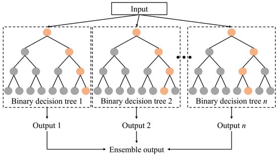 The random forest (RF) is an ensemble learning method for classification and regression tasks []. The RF combines multiple single predictors into one integrated predictor, so as to attain excellent generalization performance. These single predictors can be generated in parallel and allow for diversity among each other. Generally, the RF uses binary decision trees, such as classification and regression tree (CART), as single predictors, due to the low parameters required, strong robustness, and low training cost []. Figure 3 illustrates the topology of the RF.