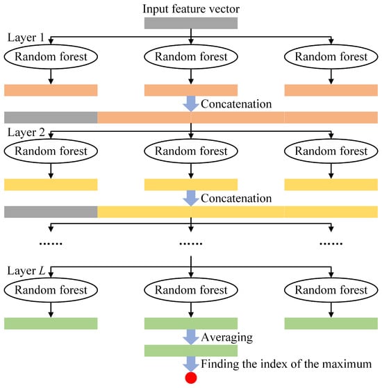 In the last layer of the DRF, the class probability vectors of all RFs here will be averaged to obtain the final class probability vector, as shown in Equation (4). The index corresponding to the maximum in the final class probability vector is the class of the sample predicted by the DRF.