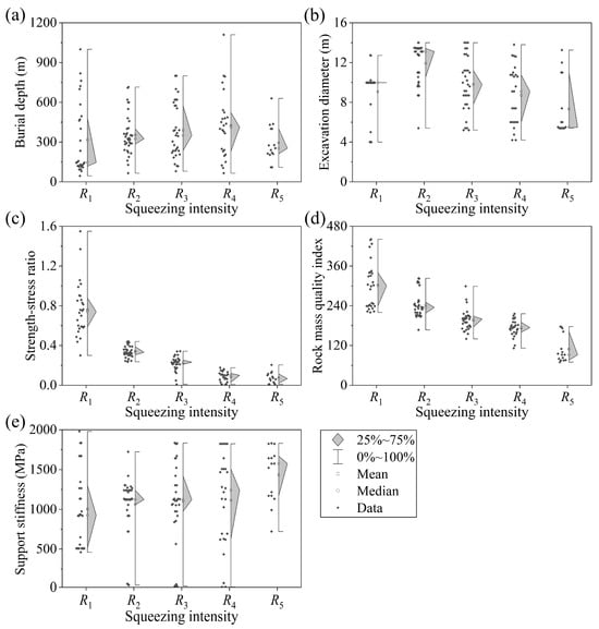 Visual statistical distribution: (a) burial depth; (b) excavation diameter; (c) strength-stress ratio; (d) rock mass quality index; and (e) support stiffness. The R1, R2, R3, R4, and R5 denote no squeezing, mild squeezing, moderate squeezing, strong squeezing, and extremely strong squeezing, respectively.