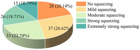 A personalized label, namely squeezing strength of surrounding rock, is used as the output parameter of each case. Based on the relative strain of the surrounding rock, the squeezing strength is divided into five grades (Table 1) [,]. When the relative strain of the surrounding rock is <1.0%, 1.0%~2.5%, 2.5%~5.0%, 5.0%~10.0%, and >10.0%, it indicates no squeezing, mild squeezing, moderate squeezing, strong squeezing, and extremely strong squeezing, respectively. In the established database, there are 28 cases with no squeezing (accounting for 20.14%), 37 cases with mild squeezing (accounting for 26.62%), 33 cases with moderate squeezing (accounting for 23.74%), 26 cases with strong squeezing (accounting for 18.71%), and 15 cases with extremely strong squeezing (accounting for 10.79%), as shown in Figure 6.
