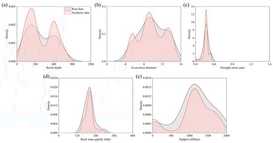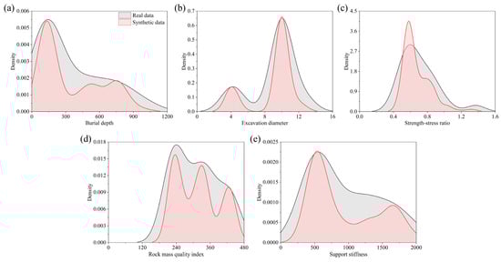 Kernel density distribution for the moderate-squeezing samples: (a) burial depth; (b) excavation diameter; (c) strength-stress ratio; (d) rock mass quality index; and (e) support stiffness.