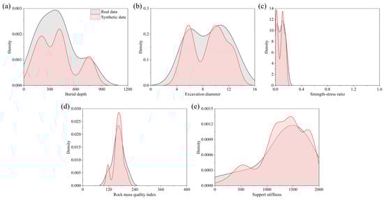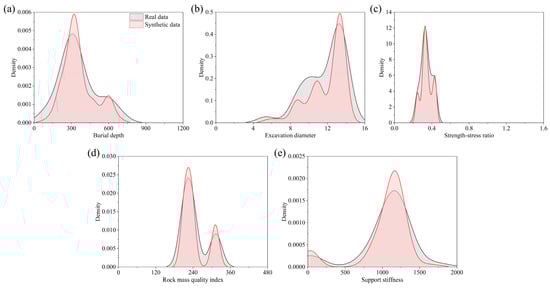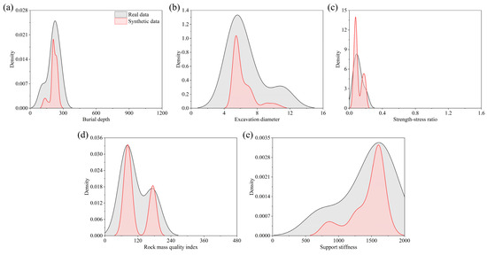 Kernel density distribution for the mild-squeezing samples: (a) burial depth; (b) excavation diameter; (c) strength-stress ratio; (d) rock mass quality index; and (e) support stiffness.