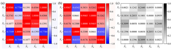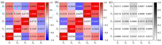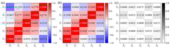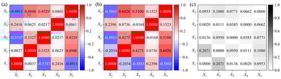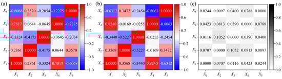 Similarity evaluation for the extremely strong-squeezing samples: (a) correlation coefficient matrix of real data; (b) correlation coefficient matrix of synthetic data; and (c) absolute difference between correlation coefficient matrices of true data and synthetic data.