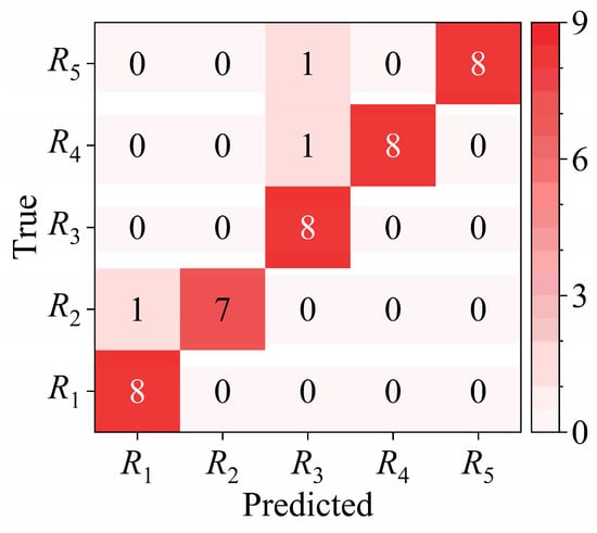 After data augmentation using the CTGAN, the DRF is trained using the augmented data. Correspondingly, the built model is referred to as the CTGAN-DRF. Based on the independent test set, the generalization performance of the CTGAN-DRF is tested quantitatively. In particular, the training and testing of the model are executed on a personal computer with Windows 10, i7-9750H CPU, 16GB RAM, and RTX 2060. Figure 17 depicts the confusion matrix of the CTGAN-DRF on the test set. In this confusion matrix, the sum of the values in each row is equal to the number of test samples of a specific class. From the bottom up, the sum of each row is eight, eight, eight, nine, and nine, which indicates that the number of test samples belonging to no squeezing, mild squeezing, moderate squeezing, strong squeezing, and extremely strong squeezing is eight, eight, eight, nine, and nine, respectively.