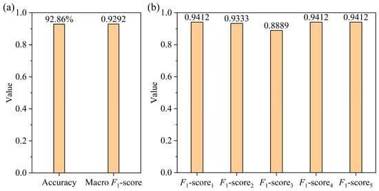 Relying on the confusion matrix, the accuracy and macro F1-score of the CTGAN-DRF are calculated using Equation (5) and Equation (6), respectively. The results reveal that the accuracy of the CTGAN-DRF is 92.86%, and the macro F1-score reaches a score of 0.9292, as shown in Figure 18a. Furthermore, the F1-score of the CTGAN-DRF on each individual class is analyzed, as illustrated in Figure 18b. It can be observed that the F1-scores on strong squeezing and extremely strong squeezing exceed 0.9, which means that the CTGAN-DRF attains superior prediction reliability for high-grade squeezing disasters and makes significant contribution to squeezing management.