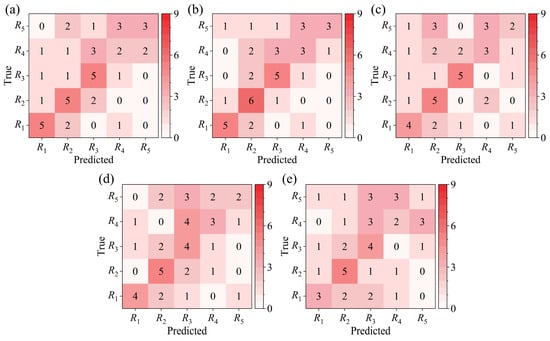 Confusion matrix: (a) BPNN; (b) SVM; (c) GPC; (d) NBC; and (e) KNN. The R1, R2, R3, R4, and R5 denote no squeezing, mild squeezing, moderate squeezing, strong squeezing, and extremely strong squeezing, respectively.