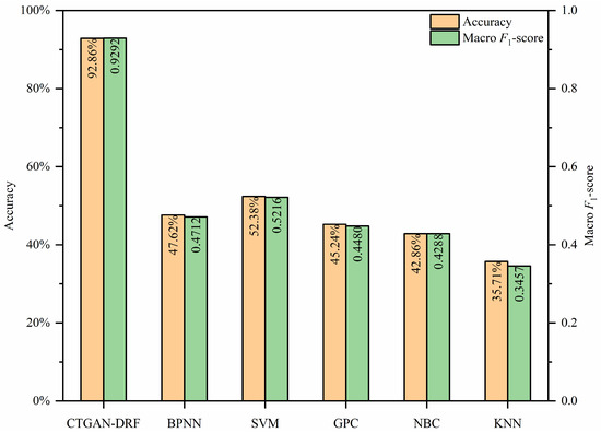 In this section, we compared the proposed CTGAN-DRF with the BPNN, SVM, GPC, NBC, and KNN in terms of the prediction performance of squeezing disaster. The confusion matrices of the BPNN, SVM, GPC, NBC, and KNN are shown in Figure 19, based on which the accuracy and macro F1-score of the BPNN, SVM, GPC, NBC, and KNN are calculated according to Equation (5) and Equation (6), respectively. Referring to Figure 20, in comparison with the BPNN, SVM, GPC, NBC, and KNN, the accuracy of the CTGAN-DRF is increased by 45.24%, 40.48%, 47.62%, 50.00%, and 57.14%, respectively, and the macro F1-score is raised by 0.4579, 0.4075, 0.4812, 0.5003, and 0.5834, respectively. Based on these strong evidences, the superiority of the CTGAN-DRF is demonstrated.