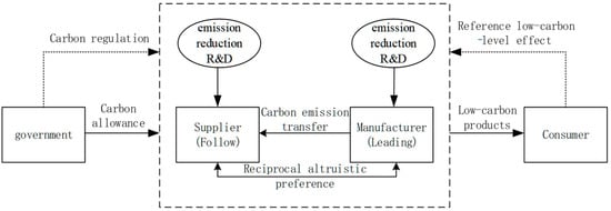 6]. Under the influence of reciprocal altruistic preferences, supply chain enterprises care about their own interests as well as the interests of upstream and downstream enterprises, and adopt methods such as cooperation or concessions to ensure the stability of the supply chain structure. For example, in order to ensure the mass production of mobile phones, Apple purchases high-end equipment for its partners; Uber uses information technology to solve the problem of car owners and passengers renting a car in both directions and realize economic sharing. With the development of economic globalization, under the initiative of the concept of mutual benefit and win-win scenarios, supply chain members pay more and more attention to win-win cooperation with their partners, and their preference for mutual benefit and altruism will become more pronounced, which will have an important impact on the decision making of enterprises. In addition, the cooperative relationship in the supply chain is usually not a single cycle behavior, but a long-term and continuous cooperative relationship, in which enterprises achieve the goal of reducing costs and expanding the market through long-term cooperation. The differential game model is game theory applied to dynamic systems, which describes a continuous game played by multiple participants to obtain their strategies that change over time and reach Nash equilibrium. It is a suitable model for studying long-term problems. Therefore, to address the above issues, this paper will use differential game theory to construct a carbon emission transfer model between low-carbon supply chain members based on dynamic game theory. The reference low-carbon-level effect of consumers and the reciprocal altruistic preference of enterprises will be incorporated into the supply chain operation decisions to study the carbon emission transfer strategy of the supply chain. From a dynamic perspective, the optimal carbon emission transfer decisions of manufacturers and suppliers with or without reciprocal altruistic preferences will be analyzed. How will the reference low-carbon-level effect of consumers and the reciprocal altruistic preference of supply chain members affect the carbon emission transfer amount of manufacturers and the carbon emission transfer undertaking amount of suppliers? What impact does carbon emission transfer have on the low-carbon level of products and supply chain efficiency?