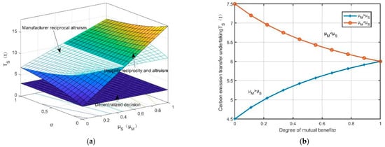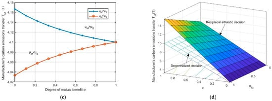 (2) The mutual altruism between both parties increases the manufacturer’s and supplier’s transfers, thus improving the low-carbon levels of their products. With reciprocal altruistic preferences, the difference in the degrees of altruism of both parties also affects the amounts of emissions transferred and accepted by the manufacturer and supplier, respectively.