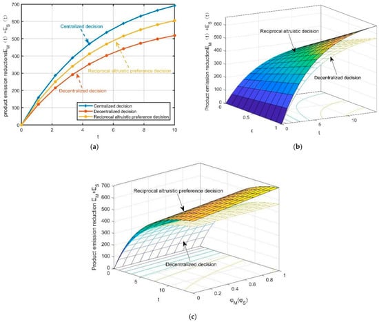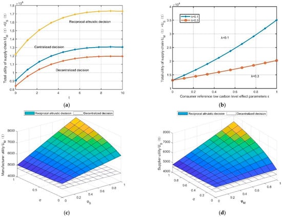 (3) Under the influence of the reference effect, the reciprocal altruistic preferences of both parties can effectively coordinate the supply chain, enhance its utility, and achieve a Pareto improvement in decentralized decision making. The lower the memory parameter of the consumers, the higher the overall utility of the supply. Therefore, while reducing their own pressures related to emission reduction and improving the low-carbon levels of their products through transfers, both parties should strengthen communication with their consumers to enhance their memory of low-carbon product information.