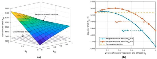 Corollary 3 shows that under the influence of the consumers’ reference low-carbon-level effect when both parties have reciprocal altruistic preferences, they will make decisions to increase low-carbon levels and consumer demand. When the supplier has such preferences, they will consider the interest of the manufacturer. On the one hand, the supplier will increase their investments in emission reduction, improve the low-carbon levels of their intermediate products, and promote market demand. On the other hand, they will increase the accepted carbon emission transfer level and alleviate the pressure on manufacturers to reduce emissions. Similarly, when the manufacturer has reciprocal altruistic preferences, they will try their best to help the supplier increase their profits. Therefore, the manufacturer will utilize the supplier’s altruistic preferences to further increase the level of carbon emission transfer and R&D investment in emission reduction to improve the low-carbon level of products and promote the increase in consumer demand. For the supplier as a follower, their commitment to helping the manufacturer increase profits would undoubtedly affect their own profits by accepting too much carbon transfer. Therefore, the supply chain members should be as reasonable as possible to show the other party a certain degree of reciprocal altruism, which would not only help to improve their own benefits and promote cooperation but also help to expand the market demand for low-carbon products, gain more social welfare for consumers, and achieve sustainable development for the supply chain.