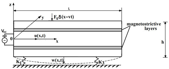 We considered a symmetric laminated composite isotropic beam made of a mixture of k-fiber reinforced polymeric material plies along with an m-smart magnetostrictive material (MsM) with the length in the x-direction and thickness in the z-direction, pinned–pinned at x = 0 and x = L. The beam was subjected by the electromagnetic actuator load VDC and the mechanical impact by the transverse constant force F0 with a speed v and by a Winkler–Pasternak type elastic foundation with the linear coefficient K1 and nonlinear coefficient K3.