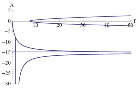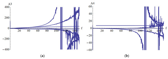 In this way, the equilibrium points A3e and A4e are well-determined from the first expression of Equation (116) and from Equation (119), respectively. Figure 9 and Figure 10 depict the variation of parameter Λ given by Equation (120) and the variations of the equilibrium points A3e and A4e obtained from Equations (116) and (119) with respect to the coefficient of mechanical impulse f.