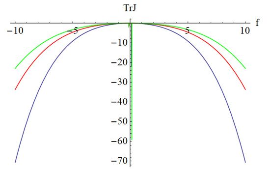 Variation of tr[J] for Λ = 0.5 (blue), Λ = 1 (red), and Λ = 1.25 (green).