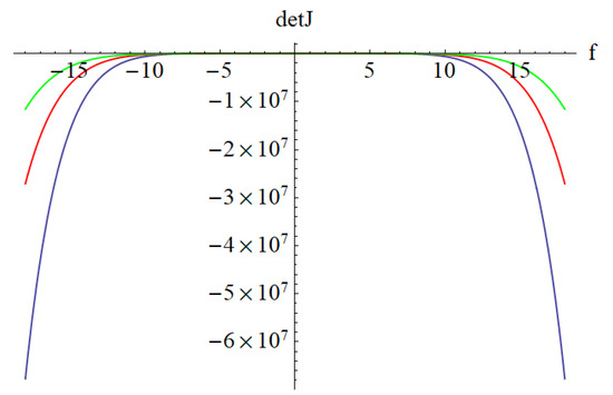 Variation of det[J] for Λ = 0.5 (blue), Λ = 1 (red), and Λ = 1.25 (green).