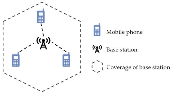 With the growing availability of sensors and data collection systems, big data has been increasingly applied in the transportation field [9,10]. In particular, mobile signaling data emerge as a highly potential-rich source of transportation big data. By 2023, there were 8.9 billion mobile phone subscriptions worldwide, meaning almost everyone owns a mobile phone [11]. As a by-product of communication billing by mobile operators, mobile phone signaling data (MSD, also referred to as cellular signaling or sighting data) offer several key advantages: a large sample size, broad population coverage, and frequent updates. These features make real-time, large-scale analyses of people’s travel behavior possible [12,13,14,15]. The collection mechanism of MSD is shown in Figure 1. When a mobile phone is located within the coverage of a base station and an interaction event occurs, the base station will create a record with information including the mobile phone ID, the interaction time, and the cellular tower ID. The location of the base station will be used to represent the location of a mobile phone.