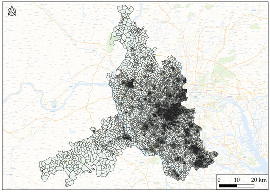 The positioning accuracy of MSD is affected by the density of base stations. The higher the density of base stations, the smaller the coverage area of base stations, and the higher the positioning accuracy of MSD, and vice versa. There are more than 9000 base stations in Foshan. In this study, the Voronoi diagram (also known as a Thiessen polygon) is used to divide the coverage area of base stations, as Figure 2 shows. The average area of the Thiessen polygon of a base station is 0.22 km2, and the median area is 0.06 km2.