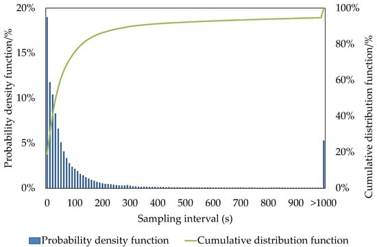 The average sampling interval of the MSD is approximately 162 s, with a median of 41 s and a variance of about 48 min. This is because users may turn off their phones at night, preventing the generation of MSD, which leads to sampling intervals of up to 8 h or longer. Moreover, the dataset only includes MSD generated within Foshan. As a result, there are no signaling data when users leave Foshan, further contributing to the longer average sampling intervals. Figure 3 illustrates the probability density function (PDF) and cumulative distribution function (CDF) of the MSD.