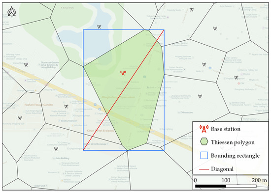 After the gridding of the study area, the coverage of each base station was converted into grid coverage. To be specific, for the Thiessen polygon of base station , we denoted the length of the diagonal of its outer rectangle as . The radius of the grid coverage of base station is denoted as :