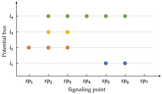 Figure 6 illustrates the matching of signaling trajectories for a direct trip. The set of potential buses for each is shown as a scatter diagram. The horizontal coordinate is the signaling point where is the origin and is the destination. The vertical coordinate denotes the potential buses. Each point in the diagram is a signaling match for a bus. The number of matching signaling points for buses , , , and are 2, 3, 2, and 5, respectively. Therefore, will be selected as the MPB. If there are multiple buses with the same number of matching signaling points, the bus with the highest number of matching GPS points in the signaling grid coverage will be chosen as the MPB.