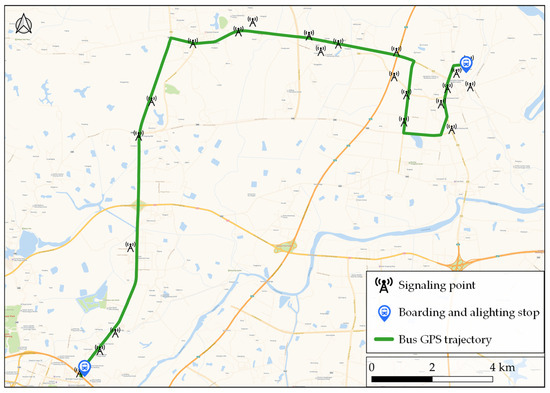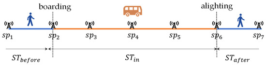 After the MPB is determined, the boarding and alighting points in the signaling trajectory are identified by extracting the overlap points between the GPS trajectory of the MPB and the user’s signaling trajectory. The entire signaling trajectory will thus be divided into three sub-trajectories: before getting on the bus (), during the bus ride (, and after getting off the bus (). As Figure 7 shows, assuming that and are the boarding and alighting of the signaling trajectory, respectively, then is from to , is from to , and is from to .