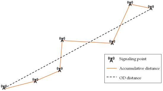 There are four spatiotemporal features of the entire signaling trajectory, including OD distance, accumulative distance, duration, and accumulative speed. Figure 8 shows the difference between the OD distance and the accumulative distance of the signaling trajectory, while Table 3 shows the notations and calculated equations of the features.