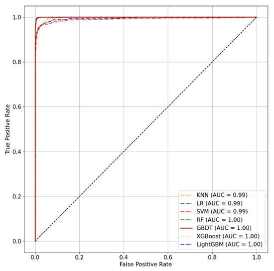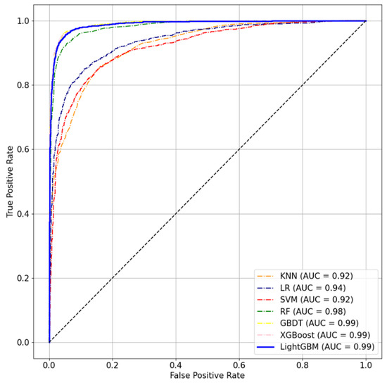 The accuracies of GBDT, XGBoost, LightGBM, and RF are all higher than 90%, with LightGBM having the highest accuracy (94.65%). From the point of view of the ROC curve, GBDT, XGBoost, and LightGBM have an area under the ROC curve (AUC) of 0.99.