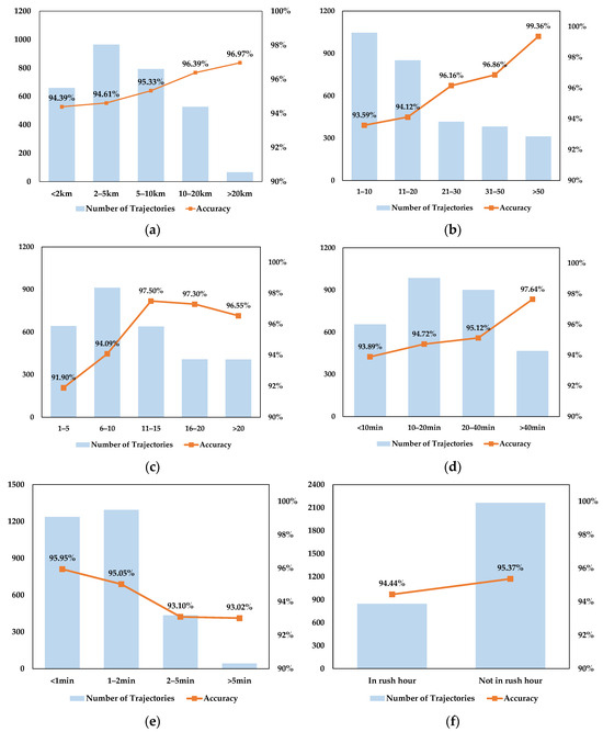 The first four factors are the spatiotemporal characteristics of the signaling trajectories, which are often positively correlated with each other. With an increase in these four factors, the signaling trajectory will be more complete and have more sample points. The calculated features will be more accurate, which leads to an increase in classification accuracy. The sampling period is an evaluation factor of the MSD collection quality; a smaller sampling period means higher data quality and higher accuracy. After the sampling rate decreases to 2 min, the accuracy begins to level off. Whether or not it is rush hour determines whether the traffic conditions are congested. According to the Traffic Congestion Index (TCI) provided by the Foshan Transportation Department, the TCIs for rush hour and not rush hour in November 2020 are 0.58 and 2.10, respectively. Higher congestion indices indicate worse traffic conditions. Therefore, the signaling trajectories are more likely to be congested during rush hour. When traveling during rush hour, the car mode and bus mode trajectories will tend to have more similar spatiotemporal features due to congested traffic conditions compared with when not in rush hour. It will increase the difficulty of classification. As shown in Figure 15f, although the accuracy of the signaling trajectories in rush hour is lower than that when not in rush hour, it can still reach more than 90%.