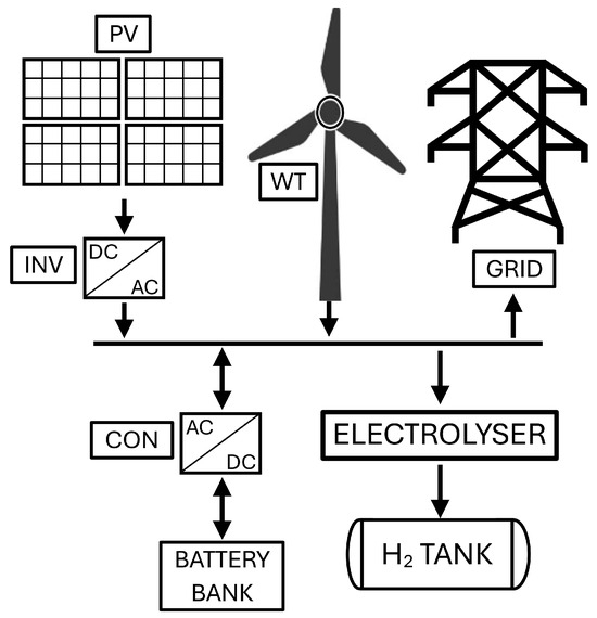 This study proposes an energy system based on renewable sources and hydrogen technologies. The system basically consists of solar photovoltaic panels (PV), wind turbines (WT), a battery bank, an electrolyzer, and a hydrogen tank (H2 TANK). An inverter (INV) is used to transform the energy coming from the photovoltaic solar panels, and a converter (CON) is used to transform the energy related to the battery bank. The main components of the system are shown in Figure 1.