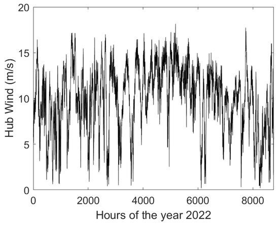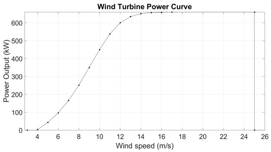where is the wind speed at the reference height , is the wind speed at the height of the hub (55 m), and is the friction coefficient (0.14 m). The power output of the wind turbine considered for the study ( = 660 kW) follows the power curve provided in Figure 2. It can be seen that the wind turbine does not operate at wind speeds below 4 m/s or above 25 m/s.