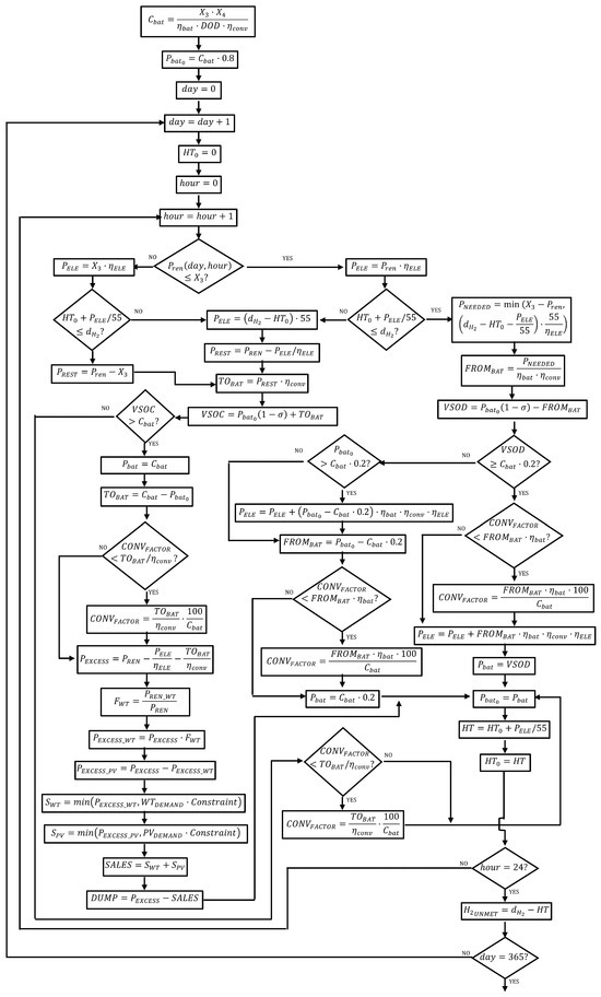 Every hour, the available renewable energy () feeds the electrolyzer. The daily hydrogen demand () must not be exceeded; therefore, the state of charge of the hydrogen tank () must be monitored. When the available renewable energy () is less than the energy required by the electrolyzer (), the energy needed is computed (), which must be provided by the battery bank (). The state of discharge of the battery bank () cannot be less than 20% of . Therefore, energy can be provided from the battery bank to the electrolyzer under this condition. On the other hand, when the available renewable energy exceeds the energy required by the electrolyzer, the battery bank is supplied with energy (). The state of charge of the battery bank () cannot exceed its maximum capacity .