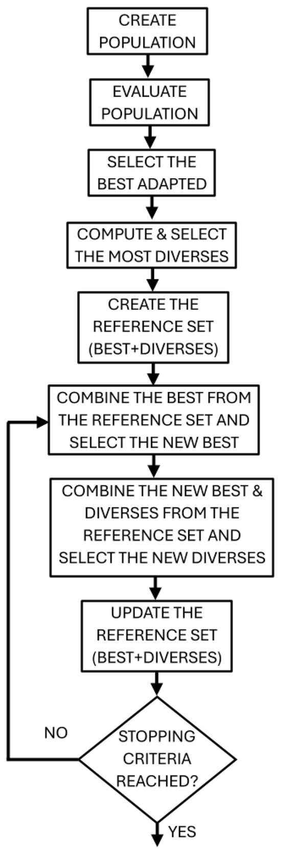 The scatter search () implementation developed in the present paper is shown by Figure 4. It is explained as follows: