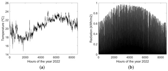 where is the irradiance at time, is the cell temperature at normal operating conditions (45 °C), is the ambient temperature at time, is the rated power of the panel (500 W), is the reference solar radiance, is the temperature coefficient of the maximum power of the photovoltaic modules (−0.0037), and is the reference temperature of the solar cell (45 °C). In order to transform solar power, an inverter is used (inverter efficiency ).