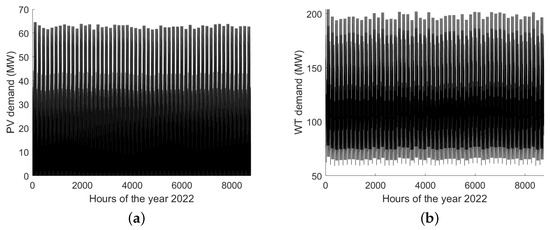 When the available renewable energy is not needed to feed the electrolyzer and the battery bank, it can be delivered to the grid (). However, the energy market sets hourly limits regarding the purchase of renewable energy. These limits are established in relation to each energy source. Therefore, the energy excess must be computed for both solar () and wind () energy. In addition, these hourly limits should be shared by all energy producers. The present study considers that the system cannot supply more than 5% of the hourly limits set by the energy market, and .