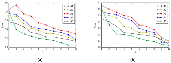 In the following, we further analyze the influence of parameter in the GIVHFWHM operator on the information fusion results, and set parameter to different values for numerical experiments, and the experimental results are shown in Figure 1a,b. When parameter is fixed, the evaluation scores of the pilot sites show a gradually decreasing tendency as parameter becomes larger, as shown in Figure 1a. At this time, the advantages and disadvantages of the pilot scheme sites are ranked as follows: A3 > A4 > A2 > A5 > A1, and the optimal pilot scheme site is A3. When parameter is fixed, the evaluation scores of the pilot scheme sites show a gradual trend of decreasing as parameter increases, as shown in Figure 1b. When , the order of the advantages and disadvantages of the pilot scheme sites Chenzhou City, Xiangtan City, Yueyang City, and Changde City changes slightly, but the combined value of the attribute scores of the pilot scheme sites, and the advantages and disadvantages of the pilot scheme sites are ranked as follows: A3 > A4 > A2 > A5 > A1, and the optimal pilot scheme site is A3. In conclusion, in the reality of the decision-making process, the evaluation of the attribute information will exist in each other’s redundancy, complementarity, and other correlations, so, only by fully considering the correlations between attributes, can we achieve a more efficient decision making. Therefore, only by fully considering the correlation between attributes can the decision be more reasonable. Therefore, the GIVHFWHM algorithm studied in this paper is more suitable for the real situation and is operable.